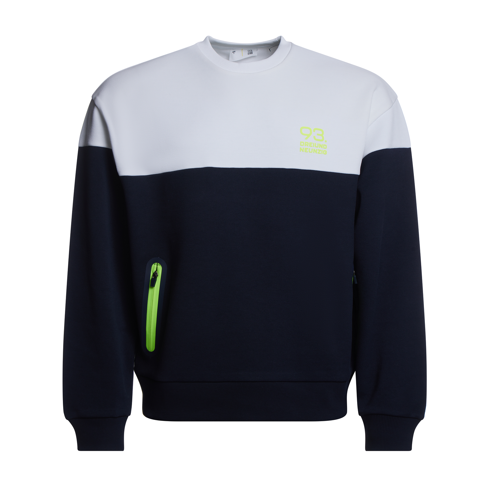 Sweater Piqué in Weiß und Midnight Blue für Männer! Gefertigt aus 100% Baumwolle mit Piqué-Gewebe, bietet dieser Sweater nicht nur einen stylischen Look, sondern auch erstklassigen Tragekomfort. Die hochwertigen Silikon-Badges in Neon Gelb setzen coole Akzente und verleihen diesem Sweater das gewisse Extra. Ein Must-Have für alle, die Stil und Qualität schätzen.